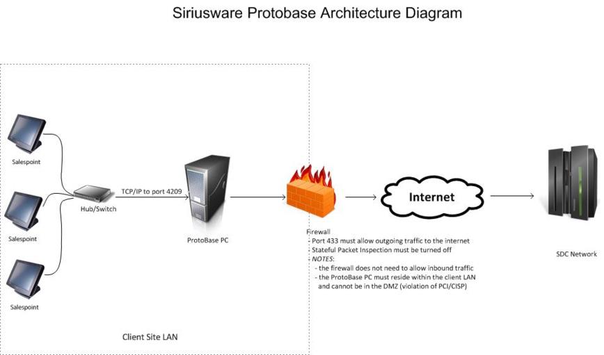 The overall Salesware architecture diagram shows how a credit card processor can be integrated into the Salesware architecture. The majority of clients incorporate the ProtoBase system. The following diagram shows how the ProtoBase system is configured. Hardware requirements for the ProtoBase PC are available from the http://www.protobase.com web site.