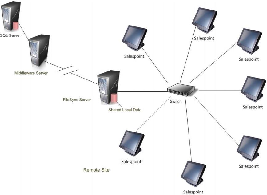 The following diagram shows a Table Service Food and Beverage module installation that implements a FileSync server. The FileSync server is used to ensure that operations aren’t interrupted in the event that the connection is lost to the database server. (Quick Service Food and Beverage module does not implement a FileSync server, because all sales are finalized immediately.)