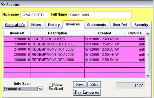 When using multiple auto scan invoices, the process is to select an auto scan invoice for the account and allow redemptions to be tracked to that invoice for X number of days. When you are ready to bill the hotel/tour operator, edit the account and select a different auto scan invoice for tracking future redemptions. You may then print a statement for the invoice previously used as the auto scan invoice and send it to the hotel/tour operator.