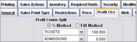 6. Click on the Profit Center tab and select the appropriate Profit Center. Revenue for the item can be split to up to six different profit centers. Using the % Method is recommended.