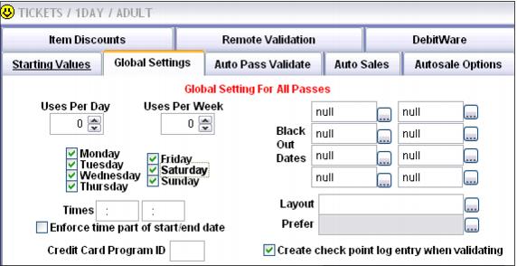 12. If necessary, click on the Global Settings tab in order to enter certain dates when the ticket is not valid for use (for instance, over certain days of the week or holiday periods).