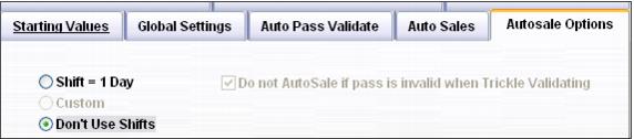 15. Click on the Autosale Options tab and either select Shift = 1 day or Don’t Use Shifts. If the guest may enter the attraction multiple times within the same day, Shift = 1Day is selected. If the guest may only enter 1 time in the day, or for multi-ride products, Don’t Use Shifts is selected.