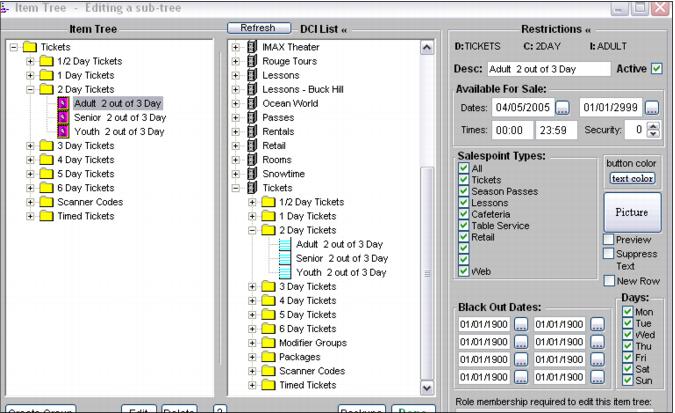 19. Expand the DCI tree on the right-hand side and drag the items into the Item Tree. You can arrange the order in which the items appear as well as edit the text and button color. Remember that you can insert “blanks” along with starting new rows in order to customize the look of the menu in Sales. Also, if this item does not appear in the menu in Sales during certain date ranges or days of the week, you can enter these restrictions by selecting the item in the Item Tree side and configuring the appropriate restrictions (shown on the right-hand side of the dialog).