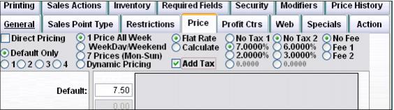 4. Click on the Price tab, select the appropriate pricing method, and enter the Price for the item. Select the appropriate tax rate if necessary. Remember to click the Add Tax check box if the tax is added to the Price of the item (without it checked, the tax is backed-out of the price of the item).