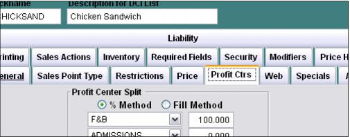 5. Click on the Profit Center tab and select the appropriate Profit Center. Revenue for the item can be split to up to six different profit centers. Using the % Method is recommended.