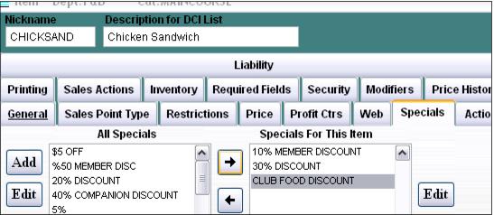 6. Click on the Specials tab and add any Specials that are allowed to discount the item (that are not already considered “global” specials that can discount any item sold in the system).