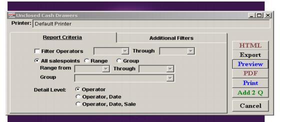 1. Look for the sessions for a day that have not been closed out ReportManager > Reports > Financial Reports > Unclosed Drawers