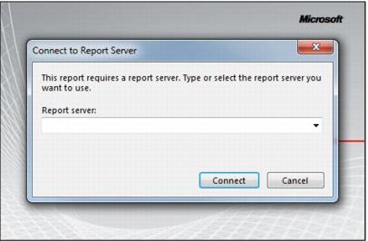Important: When opening a .RDL file in Report Builder 2.0, you receive a prompt asking you to connect to a report server (screen shot below). This is not necessary. Click Cancel to continue. Please note that the default is Connect, you must click Cancel.